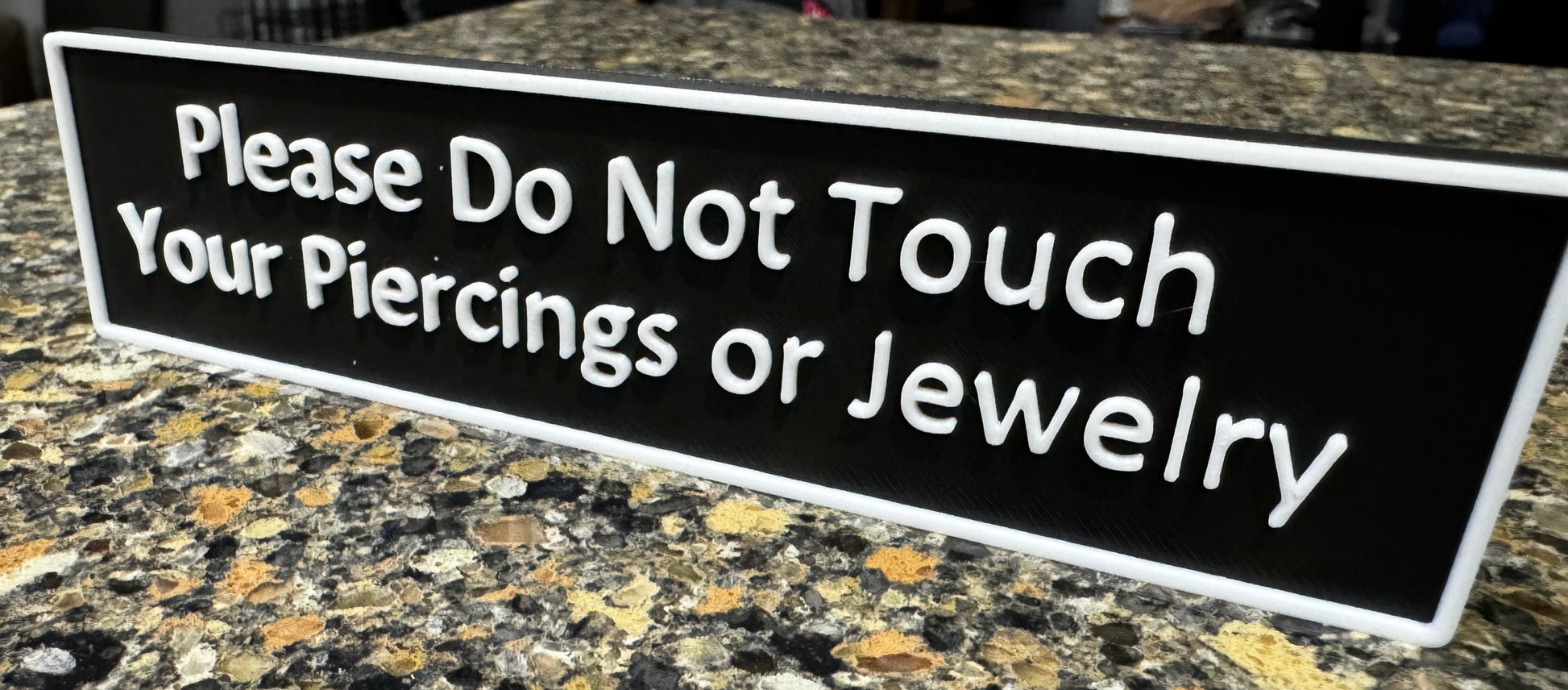 Hard plastic display sign that says “Please do not touch your piercings or jewelry” is perfect for display cases, front desks, or even piercing rooms. Measures about 6 inches wide and 1.5 inches tall carved out of exotic hardwood.