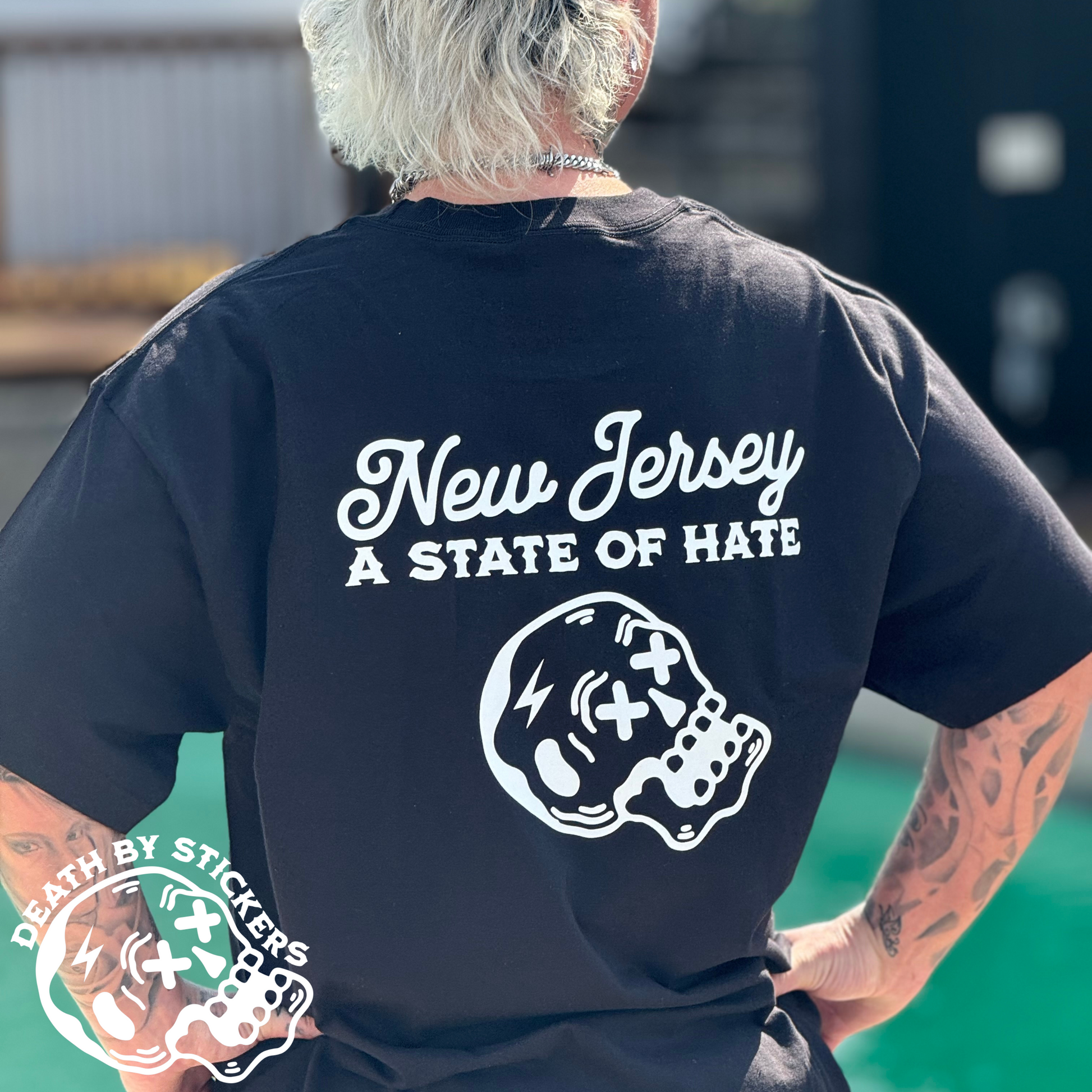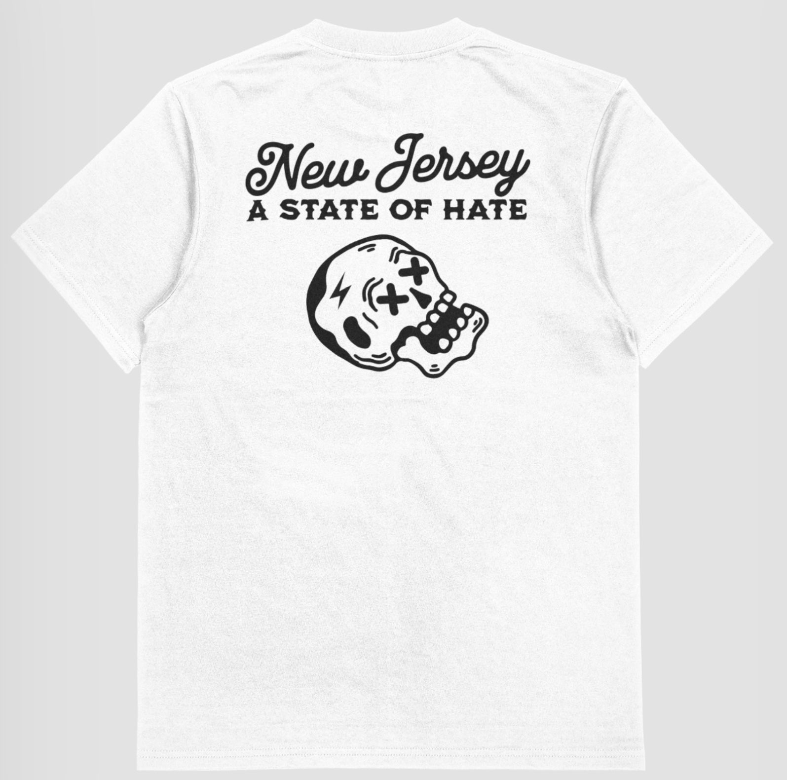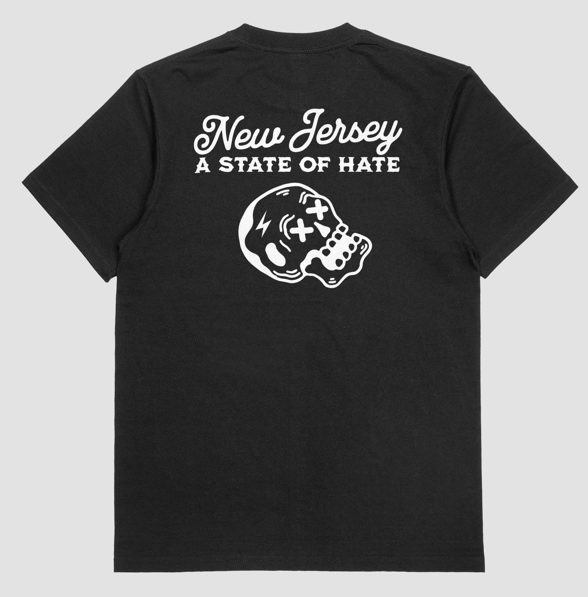 This high quality t-shirt, crew neck sweatshirt or hoodie is screen printed showing "New Jersey “A State of Hate” and our Skully mascot on the back with with a small chest pocket size Skully on the front. Shirts are available in White or Black, Hoodies only in Black.