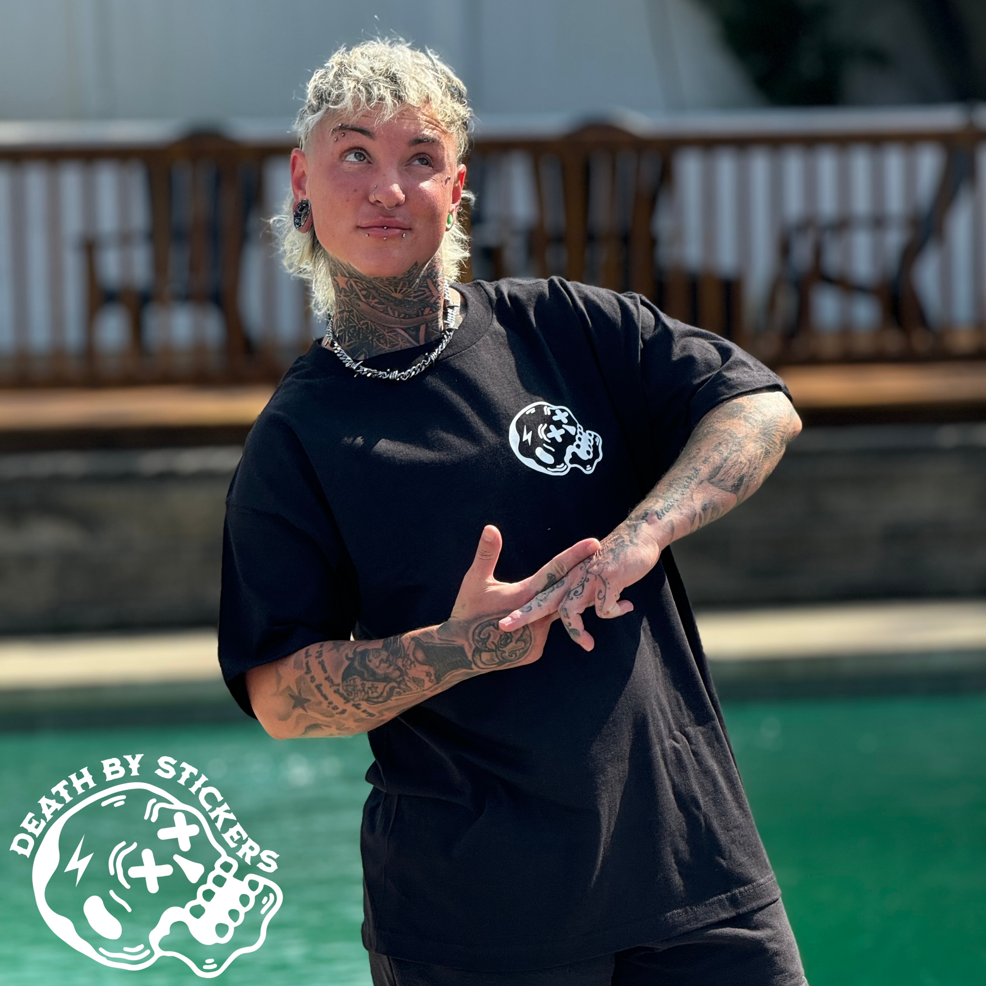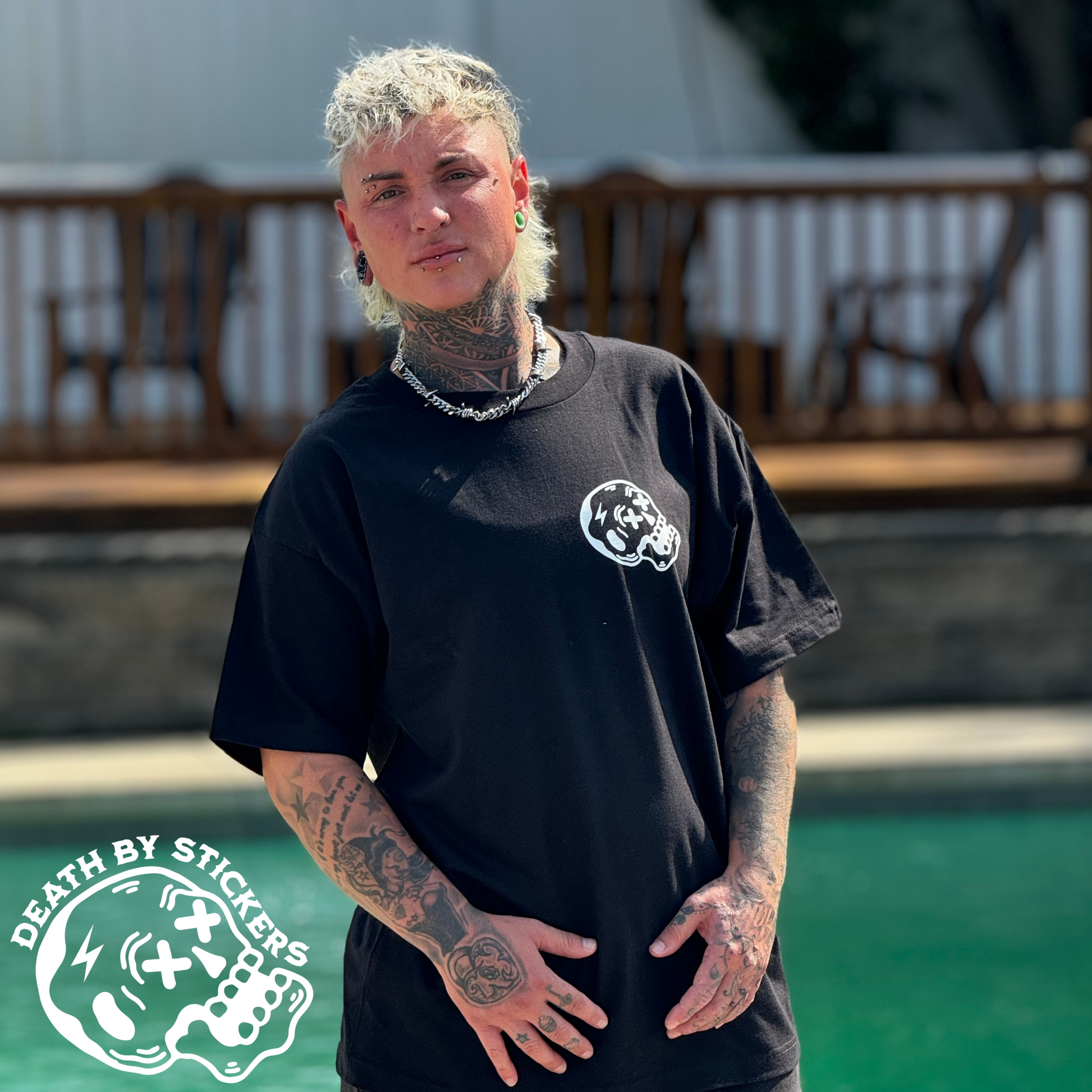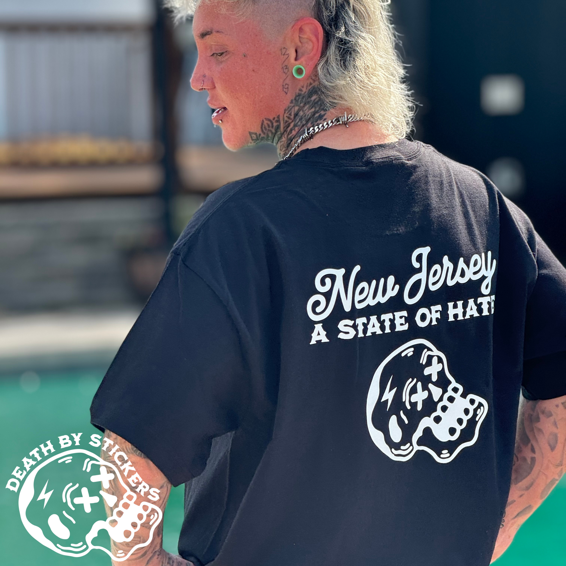 This high quality t-shirt, crew neck sweatshirt or hoodie is screen printed showing "New Jersey “A State of Hate” and our Skully mascot on the back with with a small chest pocket size Skully on the front. Shirts are available in White or Black, Hoodies only in Black.