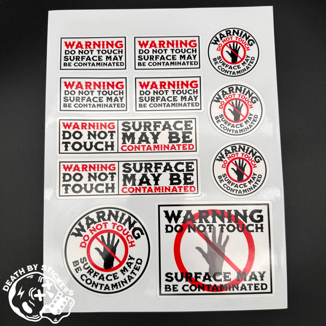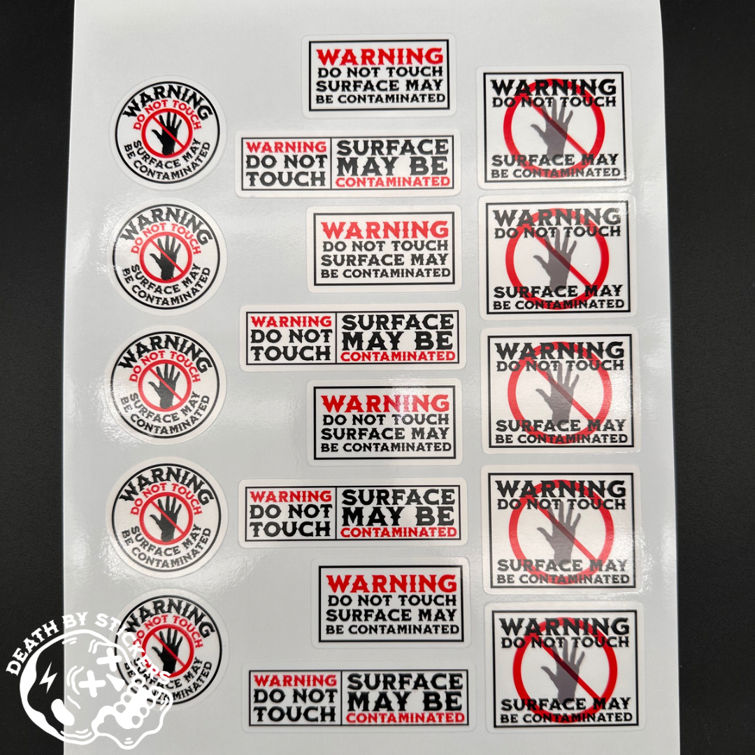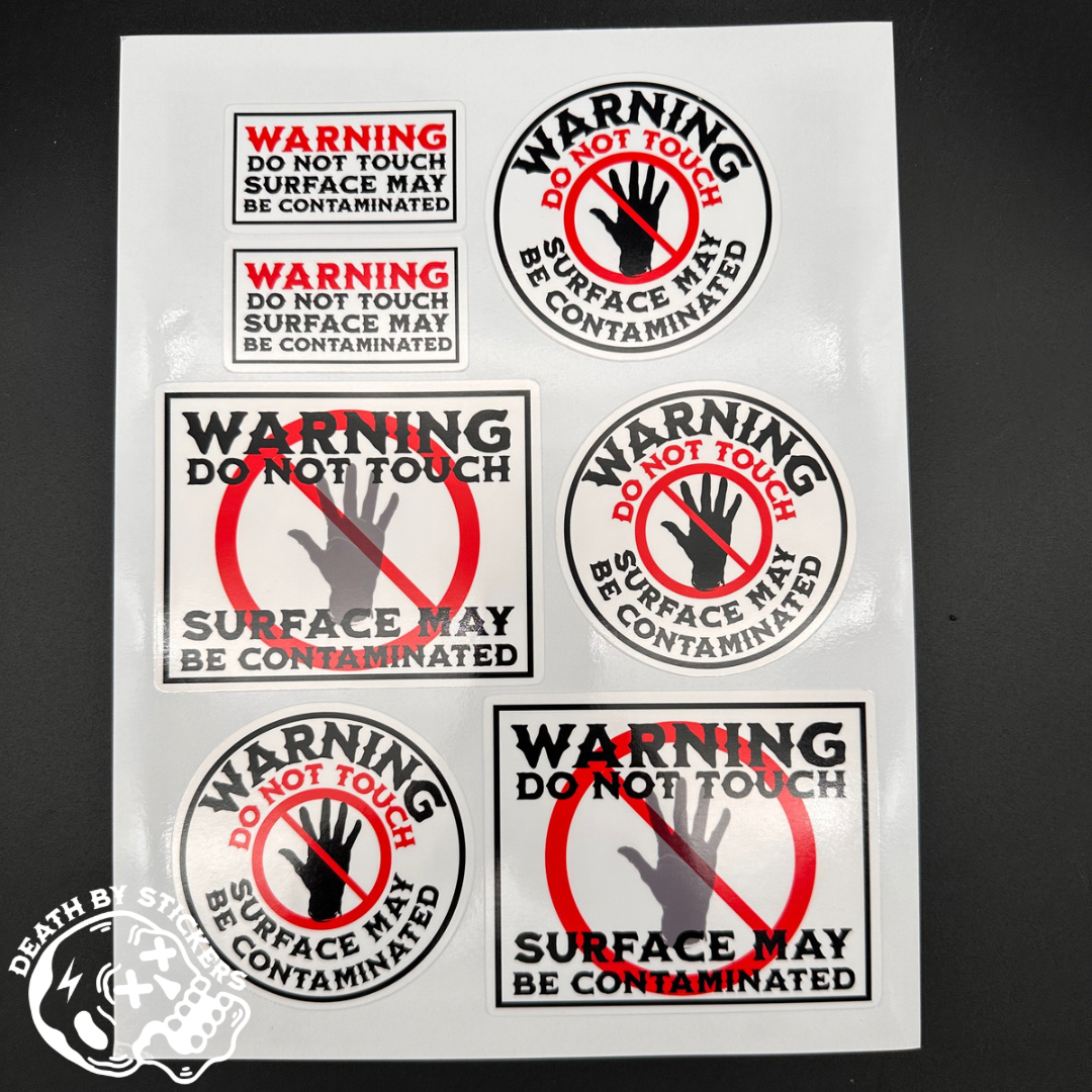These stickers are white vinyl and laminated to withstand surfaces that get touched, cleaned, and abused throughout the day. They are removable in case you need to remove them. They serve as a warning to not touch a surface with gloves and it may be contaminated.