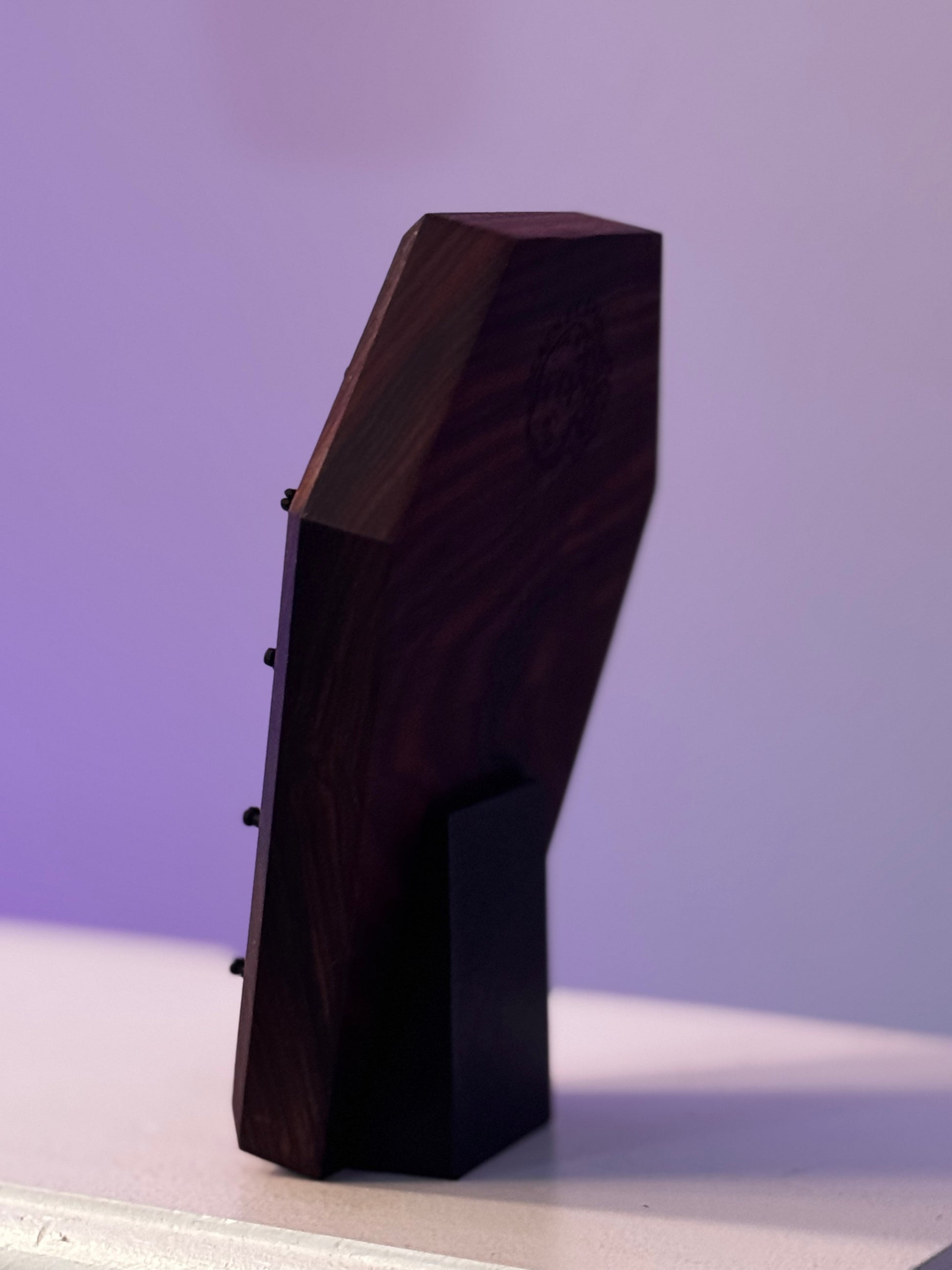 This handmade display is made of solid walnut, with a black acrylic insert, featuring 17 scratch free clips. The piece stands about 8 inches tall, it’s back is supported so this stand doesn’t fall over, the entire piece weighs about 5 pounds.